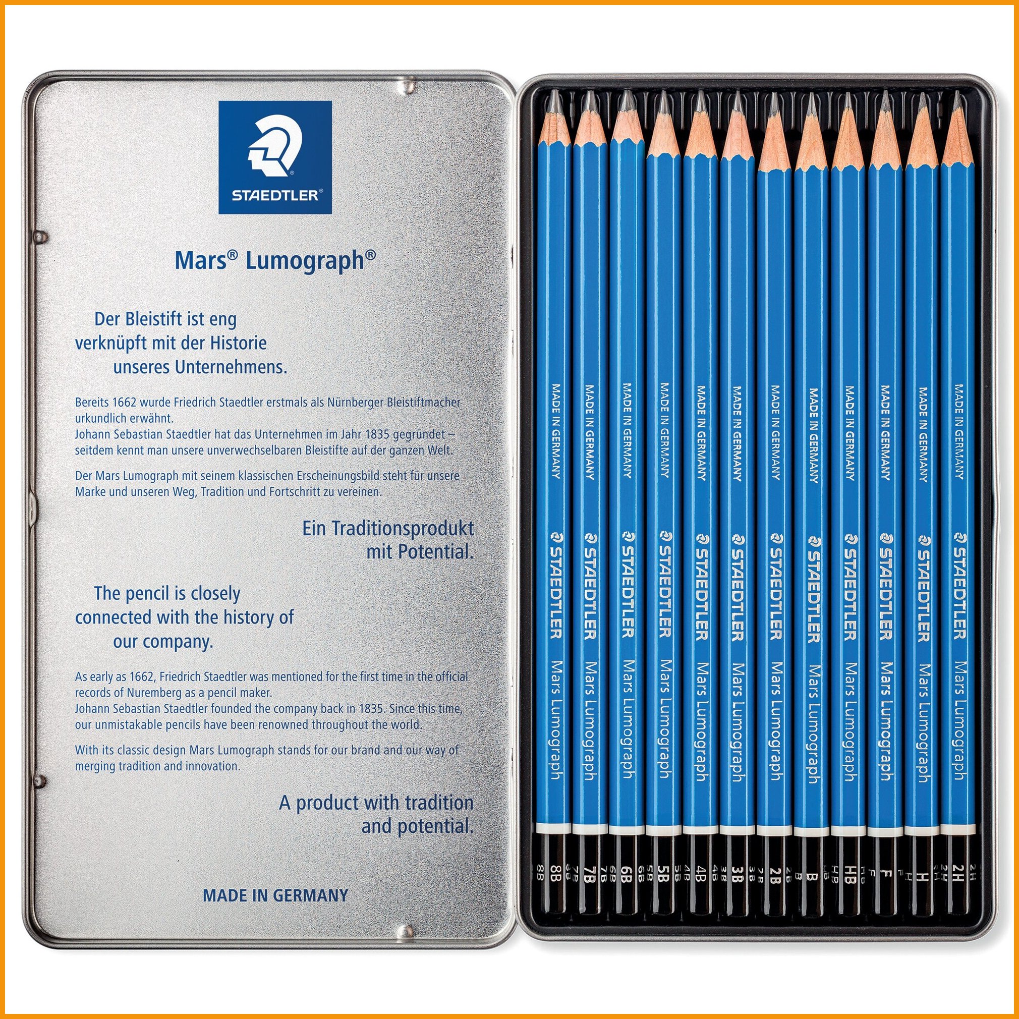 Staedtler lumograph 100 on erittäin laadukas lyijykynä, joka on erinomainen valinta kirjoittamiseen, piirustukseen ja luonnosteluun. kynän erityinen lyijyseos ei katkea helposti. lyijykynä on myös helppo pyyhkiä ja teroittaa. kynä on valmistettu pefc- sertifioidusta puuaineksesta. näppärässä metallirasiassa on 12 eri vahvuista kynää: 8b, 7b, 6b, 5b, 4b, 3b, 2b, b, hb, f, h ja 2h. Lyijykynien minimitilaus 1 paketti = 12 kpl. Tukkupakkauksessa 5. Lavalla 100.Lyijykynät toimitetaan 12 kappaleen erissä.