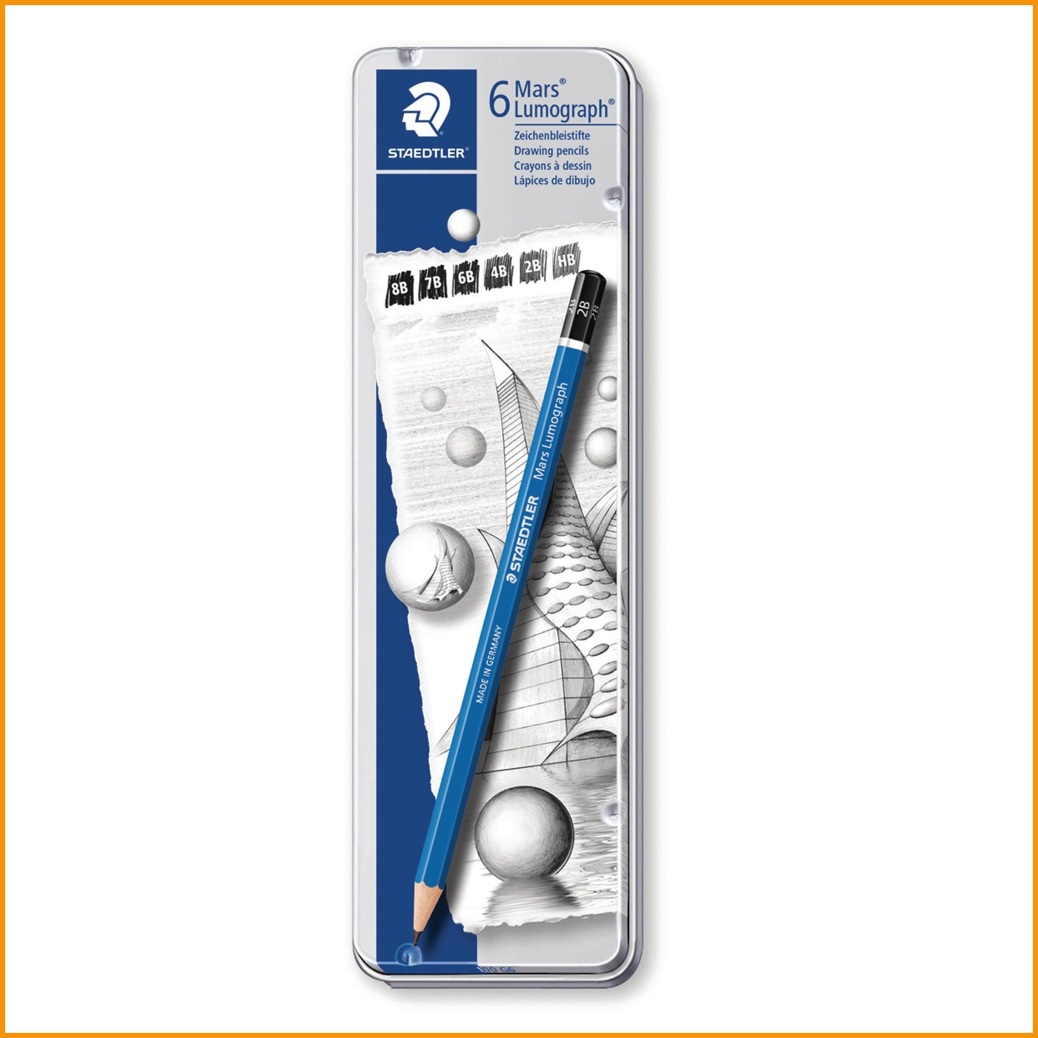 Staedtler lumograph 100 on erittäin laadukas lyijykynä, joka on erinomainen valinta kirjoittamiseen, piirustukseen ja luonnosteluun. kynän erityinen lyijyseos ei katkea helposti. lyijykynä on myös helppo pyyhkiä ja teroittaa. kynä on valmistettu pefc- sertifioidusta puuaineksesta. näppärässä metallirasiassa on 6 eri vahvuista kynää: 8b, 7b, 6b, 4b, 2b ja hb. Lyijykynien minimitilaus 1 paketti = 6 kpl. Tukkupakkauksessa 10 kpl. Lavalla 200 pakettia.Lyijykynät toimitetaan 6 kappaleen erissä.