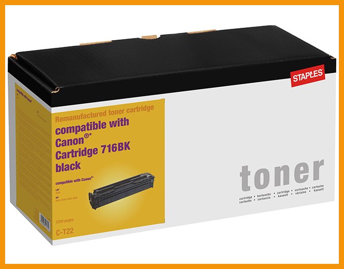 STAPLES CANON 716 BLACK 2,2K on erinomainen tulostintarvike, jonka verkkokauppatilauksen toimitus perille kestää 1-2 päivää. Tiedäthän, että toimitus on ilmainen yli 140 € hintaisille verkkokauppa ostoksille! Meiltä voit tilata laskulla ja ilman rekisteröitymistä.