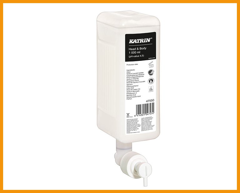 Katrin Head & Body on tehokas ja iholle hellävarainen, miedosti hajustettu suihkusaippua. Saippua jättää raikkaan tunteen ja vähentää hiusten sähköisyyttä. Pakkaus sopii Katrinin 1000 ml saippua-annostelijaan ja riittää noin 1666 annokseen.Dermatologisesti testatulla tuottella on sekä EU Ecolabel -ympäristösertifikaatti että pohjoismainen Joutsenmerkki.