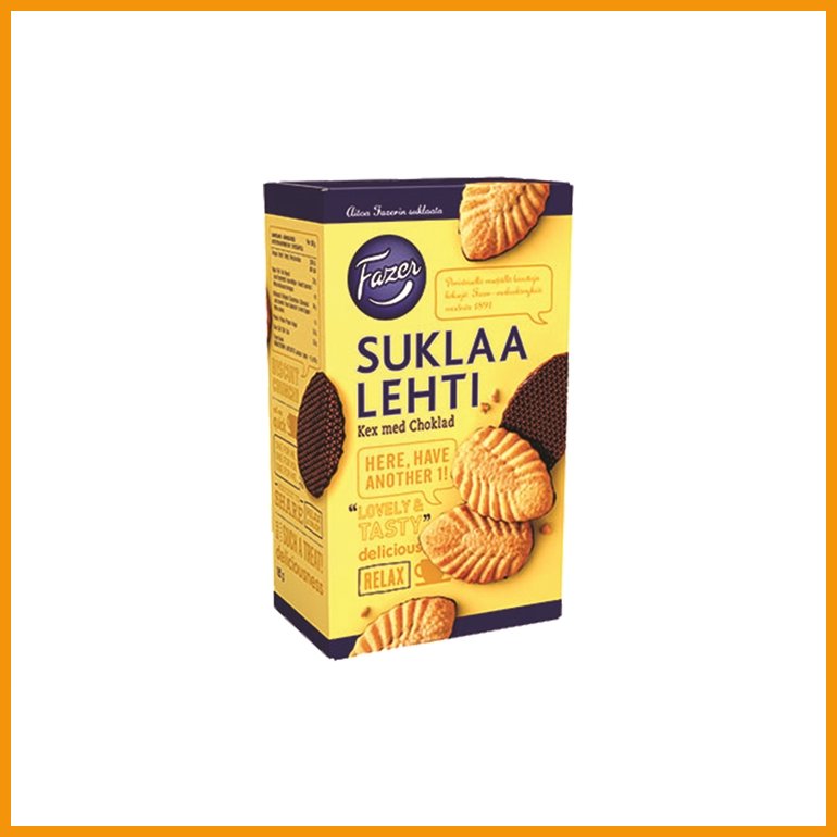 Fazerin Suklaalehti-keksissä on maittava suklaakuorrute maukkaalla keksipohjalla.Sisältö: 185 g.