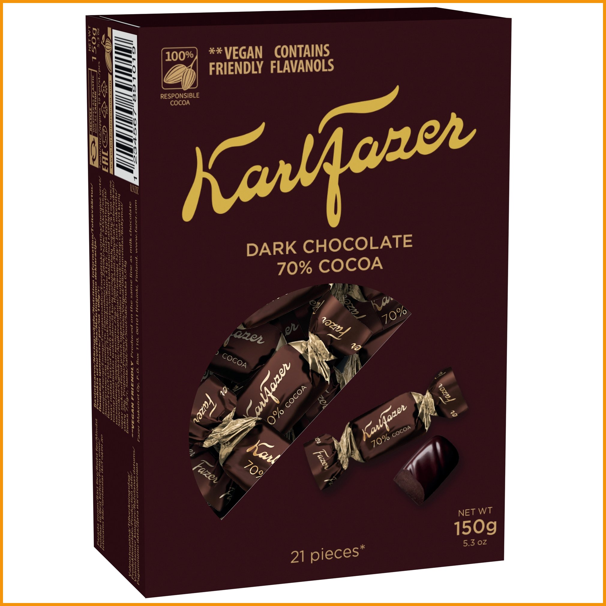 Kaikki karl fazer -suklaat valmistetaan hienoimmasta arriba-kaakaosta parhaalla ammattitaidolla. karl fazerin 70-prosenttisesta tummasta suklaasta valmistetuissa konvehdeissa on pehmeä kaakaon maku, johon ei voi olla ihastumatta. mikä parasta, kaikki fazerin herkulliset suklaat on valmistettu 100 % vastuullisesti tuotetusta kaakaosta. tuote on vegaaninen. pieni rasia sopii omaan herkutteluun tai annettavaksi lahjaksi ystävälle.Suklaakonvehti Fazer selection tumma 150g on laadukas kahviotarvike, jonka verkkokauppatilauksen toimitus perille kestää 1-2 päivää. Huomaa, että hinnaltaan yli 140 € verkkokauppatilaus toimitetaan aina ilmaiseksi! Meiltä voit tilata laskulla ja ilman rekisteröitymistä.