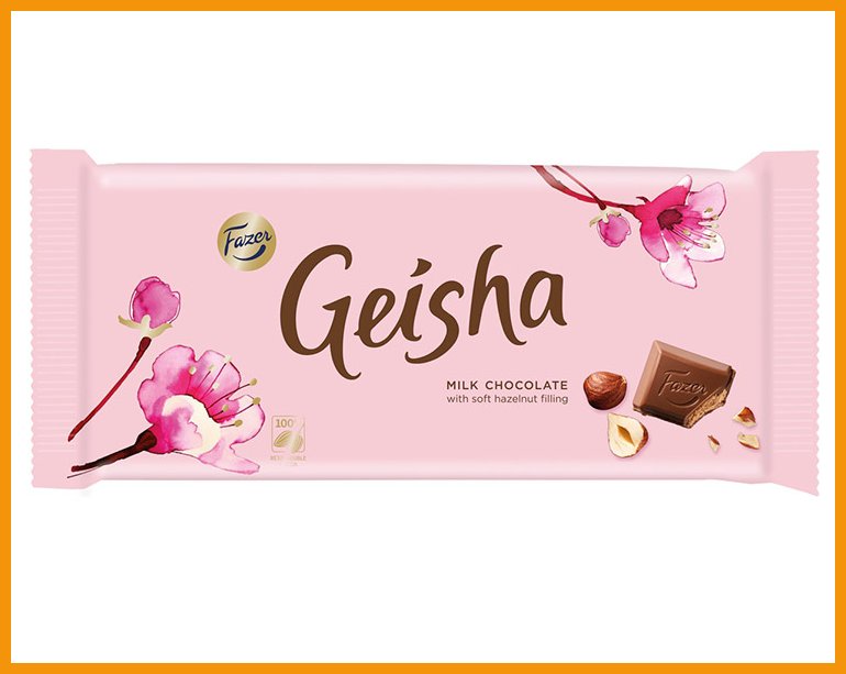 Fazer Geisha -suklaalevyn pehmeän maitosuklaakuoren sisälle kätkeytyy herkullisen rapea hasselpähkinänougat-täyte. Geisha-suklaan valmistuksessa ei käytetä palmuöljyä.Saattaa sisältää myös muuta pähkinää, mantelia ja muuta viljaa. Maitosuklaassa on vähintään 30 % kaakaota.