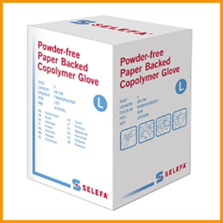 SELEFAn puuteriton EVA-kopolymeerikäsine on steriili, molempikätinen, proteiiniton ja kiinnitetty paperiin.Koko: L