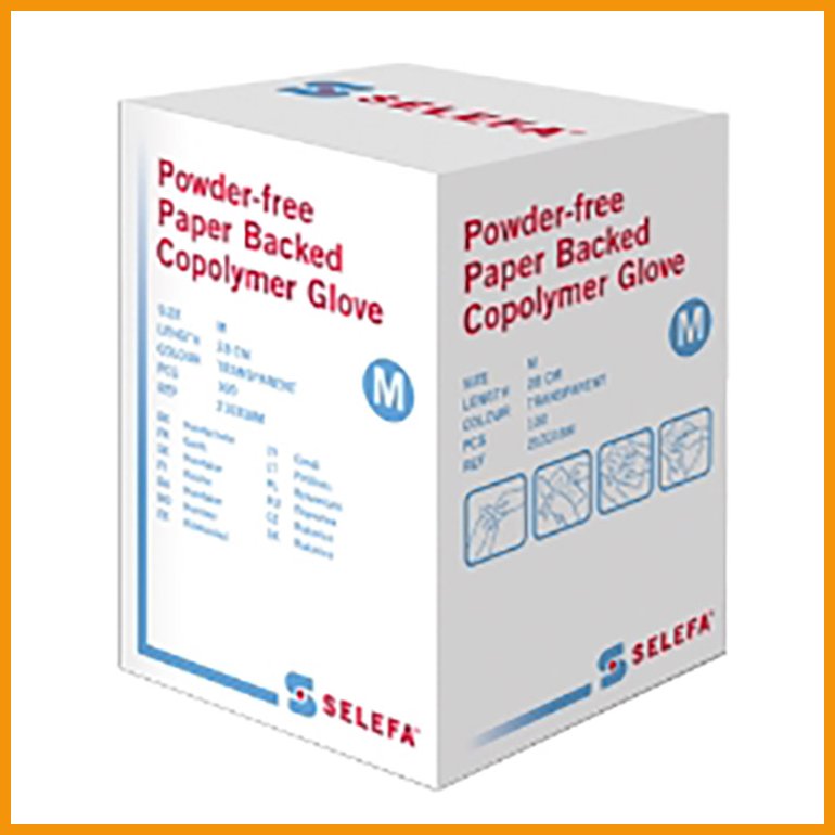 SELEFAn puuteriton EVA-kopolymeerikäsine on steriili, molempikätinen, proteiiniton ja kiinnitetty paperiin.Koko: M