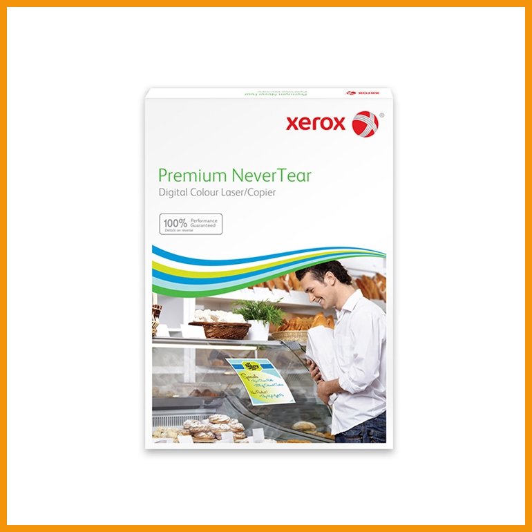 Xerox Premium NeverTear on synteettinen, polyesteristä valmistettu paperi digitaaliseen lasertulostamiseen. Sileä mattapinta sitoo hyvin värit ja kestää repeämisen lisäksi niin vettä, öljyjätteitä kuin rasvaakin, joten tuote soveltuu erinomaisesti vaativiin olosuhteisiin.Koko: A4