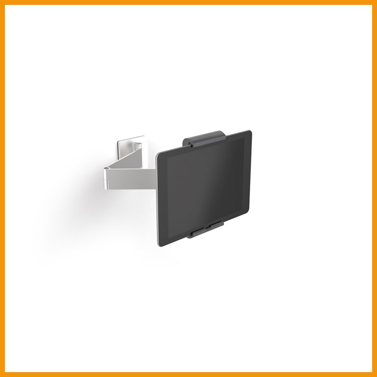 Tablet-teline Durable on seinään kiinnitettävä varrellinen teline. Teline on kätevä tilaa säästävä ratkaisu moniin työpisteisiin. Pidike kääntyy 360 astetta. Varren pituus 365mm Mitat 95 x 225 x 170 mm.
