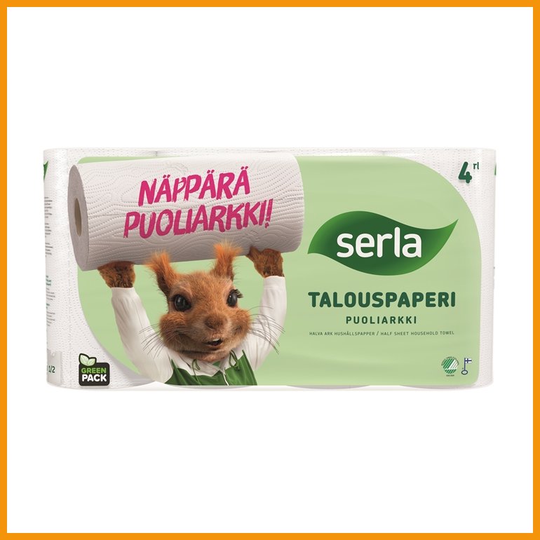Serla puoliarkki on imukykyinen, kaksinkertainen ja valkoinen talouspaperi. Puolikkaiksi arkeiksi jaettu rulla on erittäin riittoisa, kun paperia ei tarvitse ottaa liikaa.Kotimaisella tuotteella on Joutsenmerkki ja Avainlippu-tunnus.