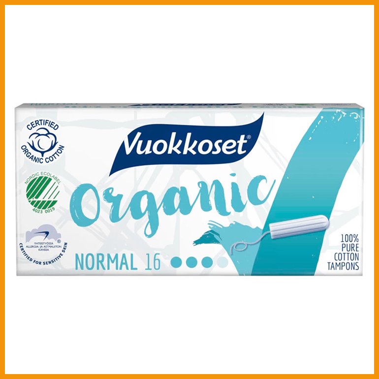 Vuokkoset Organic Tampon Normal on 100-prosenttisesti luomupuuvillasta valmistettu tamponi ilman asetinta normaaliin vuotoon. Tamponin voi kompostoida käytön jälkeen.Suomessa valmistetulla tuotteella on pohjoismainen Joutsenmerkki ja Allergia-, Iho- ja Astmaliiton tunnus.