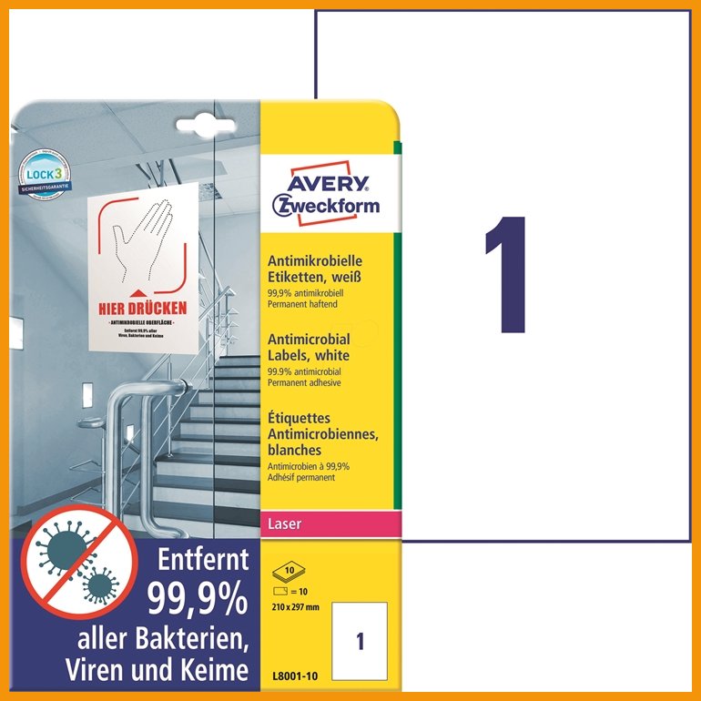 Averyn antibakteerisen tarran pinta tappaa 99,9 % viruksista ja bakteereista (ISO 22196). Vaikutus aktivoituu valon ja hapen yhdistelmästä eikä kalvoa tarvitse desinfioida erikseen. Veden- ja repäisynkestävä tarra pysyy toimintakuntoisena vuoden ajan ja kestää myös ulkokäyttöä (-20 °C - +80 °C). Tuote soveltuu sekä mustavalkoiseen että värilliseen lasertulostukseen.Tarran koko: A4