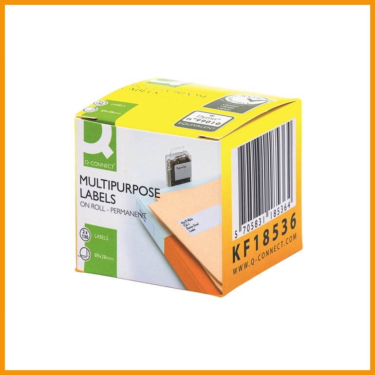 Q-CONNECTin tarrarullat ovat yhteensopivia DYMO LaberWriter 450- ja sitä vanhempien tarrakirjoittimien kanssa. Ei sovi DYMOn malleihin 550, 550turbo tai 5XLMitat: 89 x 28 mm