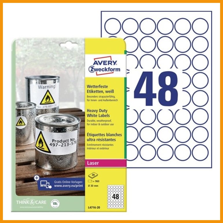 Averyn säänkestävät tarrat soveltuvat haastaviinkin olosuhteisiin. Mattapintaiset ja muodoltaan pyöreät tarrat kestävät veden ja repeämisen lisäksi myös mm. öljyä, lämpöä ja UV-säteilyä. Parhaan lopputuloksen saat lasertulostimella.Tarran halkaisija: 30 mm