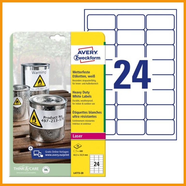 Averyn säänkestävät tarrat soveltuvat haastaviinkin olosuhteisiin. Mattapintaiset, kulmistaan pyöristetyt tarrat kestävät veden ja repeämisen lisäksi myös mm. öljyä, lämpöä ja UV-säteilyä. Parhaan lopputuloksen saat lasertulostimella.Tarran mitat: 63,5 x 33,9 mm