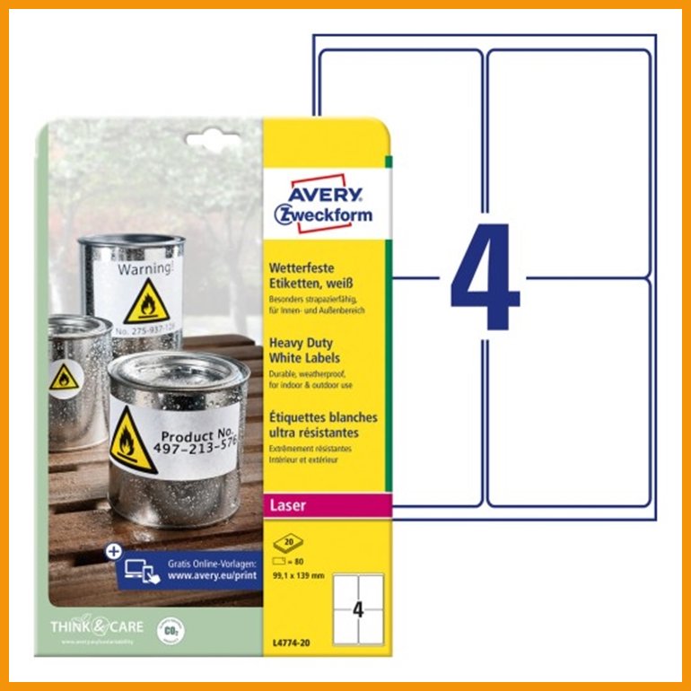 Averyn säänkestävät tarrat soveltuvat haastaviinkin olosuhteisiin. Mattapintaiset, kulmistaan pyöristetyt tarrat kestävät veden ja repeämisen lisäksi myös mm. öljyä, lämpöä ja UV-säteilyä. Parhaan lopputuloksen saat lasertulostimella.Tarran mitat: 99,1 x 139 mm