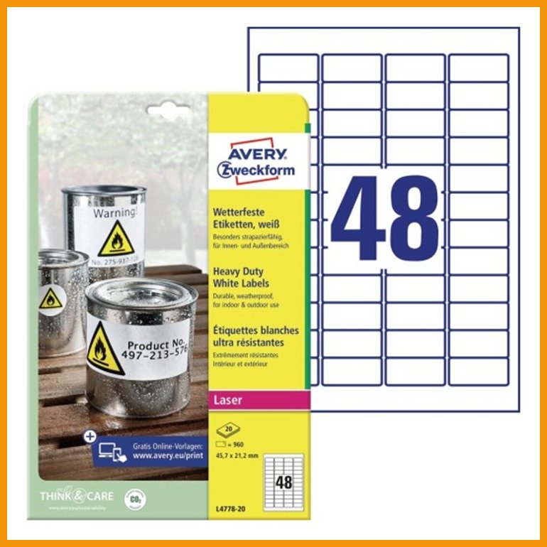 Averyn säänkestävät tarrat soveltuvat haastaviinkin olosuhteisiin. Mattapintaiset, kulmistaan pyöristetyt tarrat kestävät veden ja repeämisen lisäksi myös mm. öljyä, lämpöä ja UV-säteilyä. Parhaan lopputuloksen saat lasertulostimella.Tarran mitat: 45,7 x 21,2 mm
