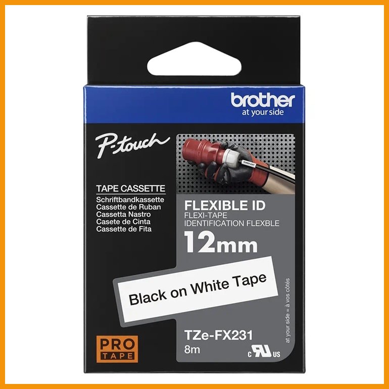 Brother TZeFX231 Flexible ID on taipuisa tarranauha etenkin johtojen ja kaapelien kestävään ja selkeään merkintään. Kasetti sopii Brother P-Touch -tarrakirjoittimiin.