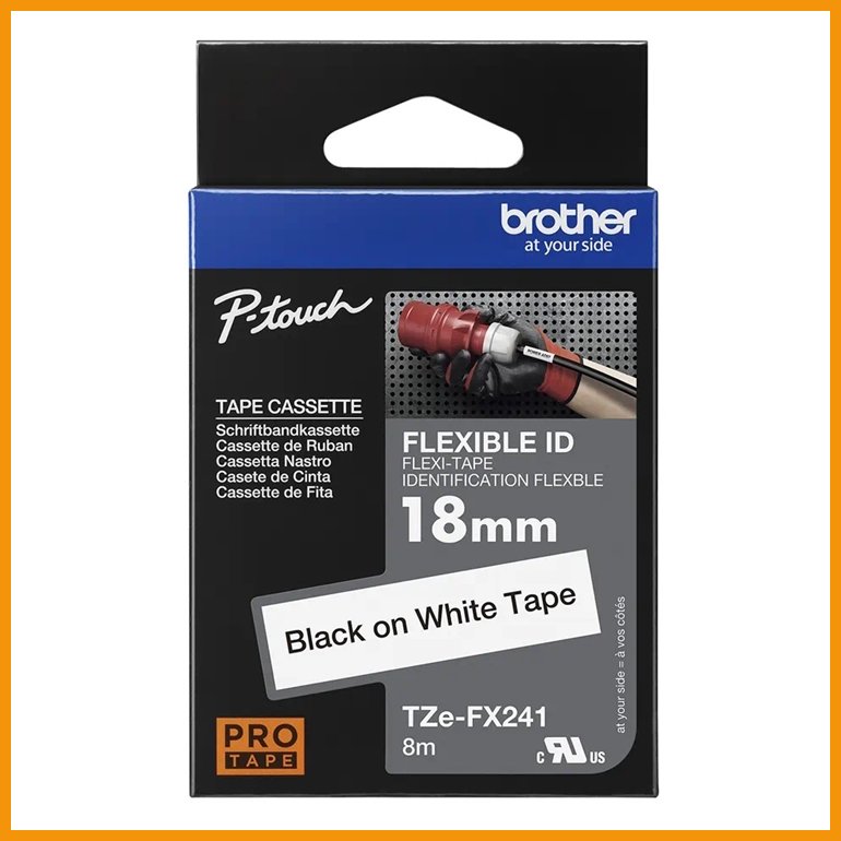 Brother TZeFX241 Flexible ID on taipuisa tarranauha etenkin johtojen ja kaapelien kestävään ja selkeään merkintään. Kasetti sopii Brother P-Touch -tarrakirjoittimiin.