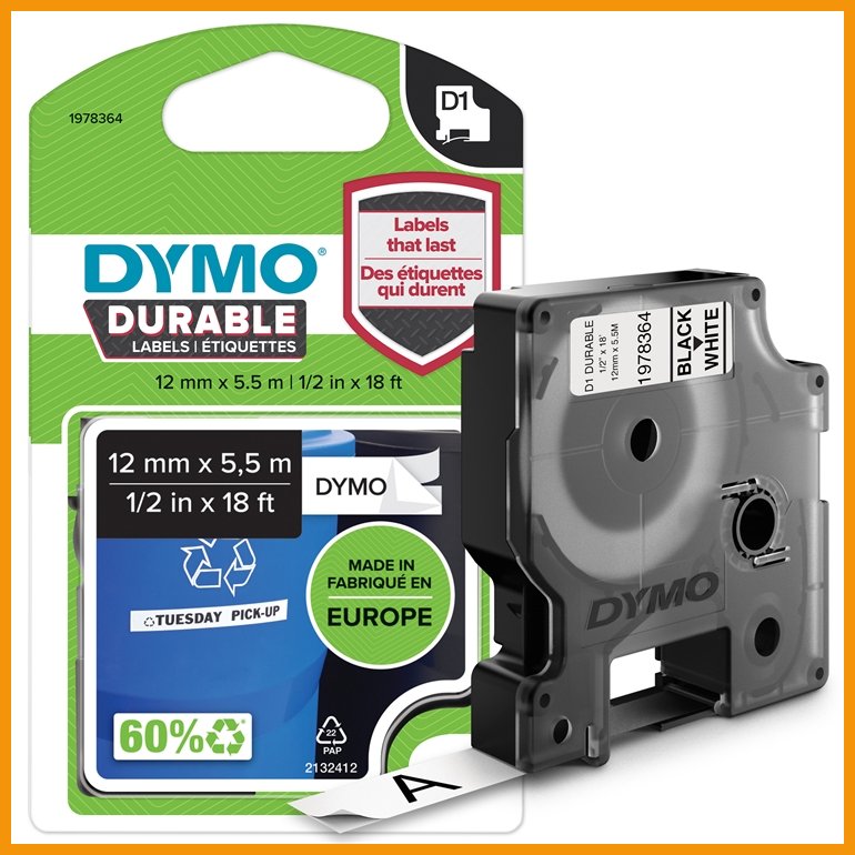 DYMO Durable D1 -tarrakasetti LabelPoint-, LabelWriter Duo- ja LabelManager-tarrakirjoittimiin. Lämpösiirtomenetelmällä tulostettavat, erittäin vahvalla liimalla varustetut tarrat tarttuvat rosoisillekin pinnoille. Tarrat kestävät erinomaisesti niin hankausta, kosteutta, auringonvaloa kuin äärilämpötilojakin (-40 °C - +80 °C).