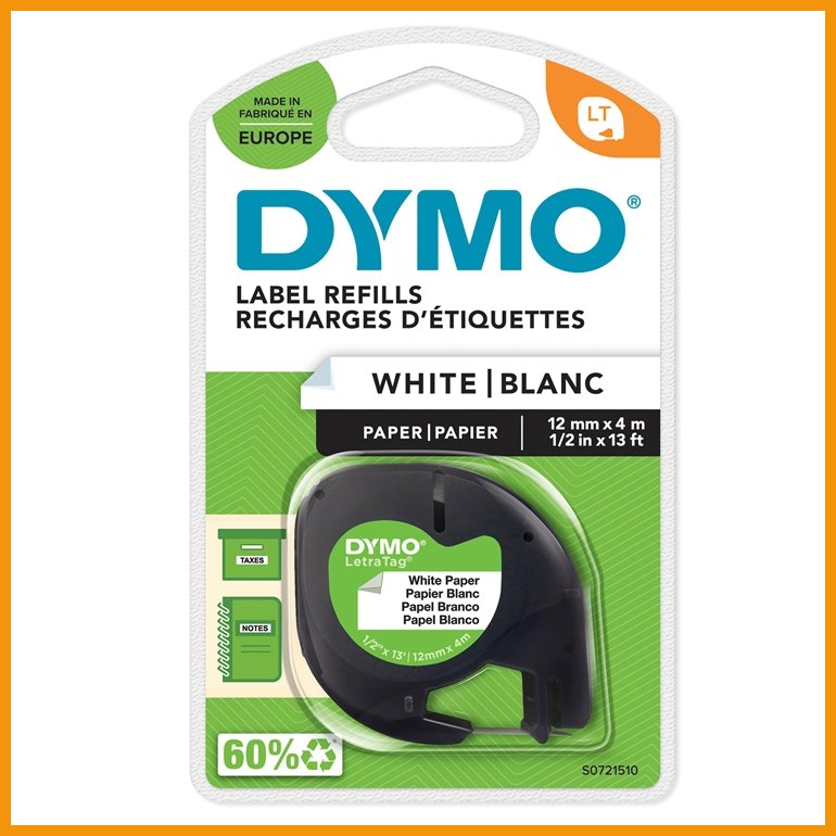 DYMO Letratag -paperitarrakasetti Letratag LT-100H -tarrakirjoittimeen. Lämpösiirtomenetelmällä tulostettavat tarrat on tarkoitettu koville, tasaisille ja puhtaille pinnoille sisätiloissa.