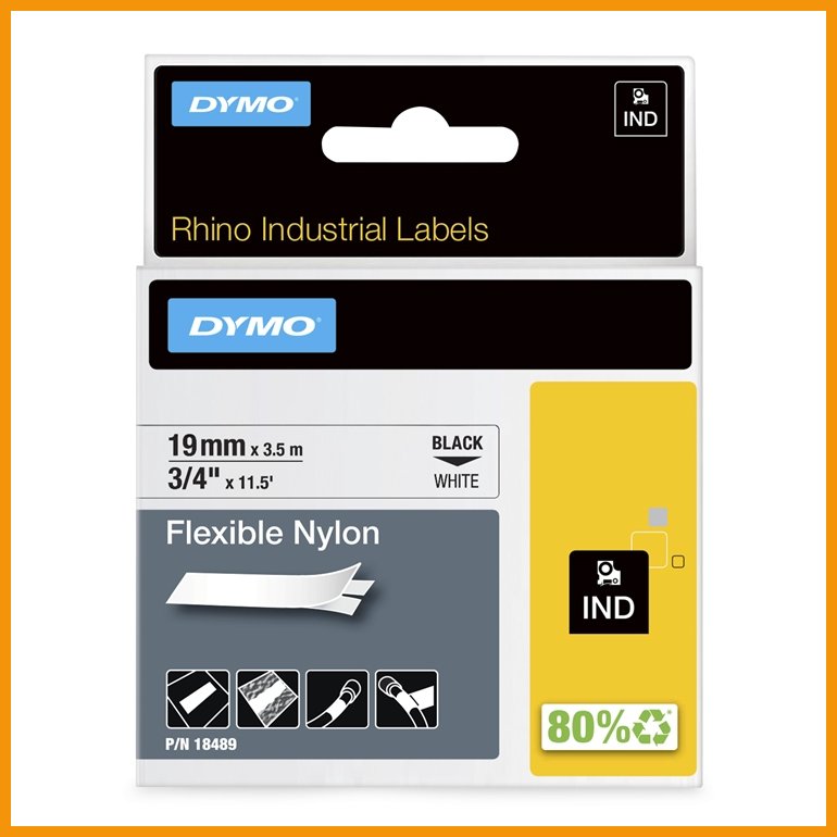 DYMO Rhino Industrial Label -nylonteippi on tarkoitettu niin sileiden kuin karkeiden ja kaarevienkin pintojen ja piuhojen merkintään. Joustava, repeämätön ja tiukasti paikallaan pysyvä teippi kestää erinomaisesti sekä kosteutta, äärilämpötiloja että UV-valoa eikä teksti haalistu. Tuote on valmistettu 80-prosenttisesti kierrätysmateriaalista.