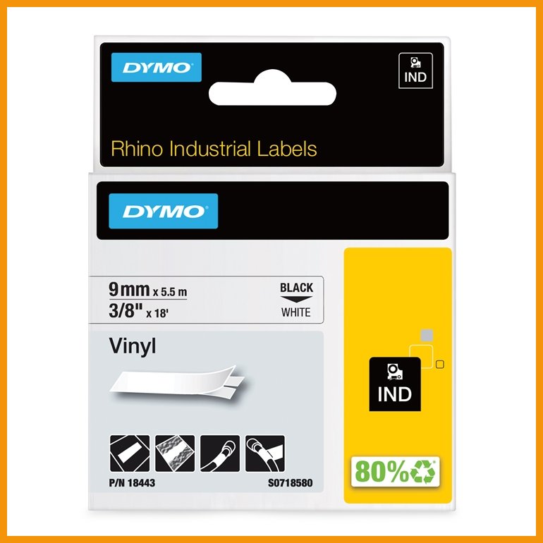DYMO Rhino Industrial Label -vinyyliteippi on tarkoitettu vaativien pintojen merkintään. Joustava ja tiukasti paikallaan pysyvä vinyyliteippi kestää erinomaisesti sekä kosteutta, UV-valoa että kemikaaleja tekstin haalistumatta. Tuote on valmistettu 80-prosenttisesti kierrätysmateriaalista.
