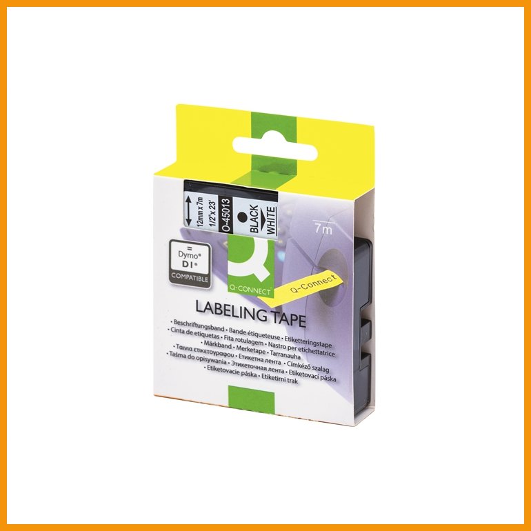 Q-CONNECT 45013 on DYMO D1 -yhteensopiva tarrakasetti DYMOn LabelManager-, LabelWriter- ja MobileLabeler-tarratulostimiin. Lämpösiirtomenetelmällä tulostettava teippi tarttuu erinomaisesti tasaisille ja puhtaille pinnoille.