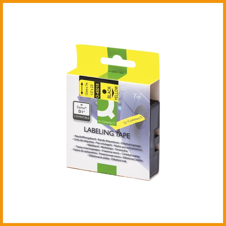 Q-CONNECT 45018 on DYMO D1 -yhteensopiva tarrakasetti DYMOn LabelManager-, LabelWriter- ja MobileLabeler-tarratulostimiin. Lämpösiirtomenetelmällä tulostettava teippi tarttuu erinomaisesti tasaisille ja puhtaille pinnoille.