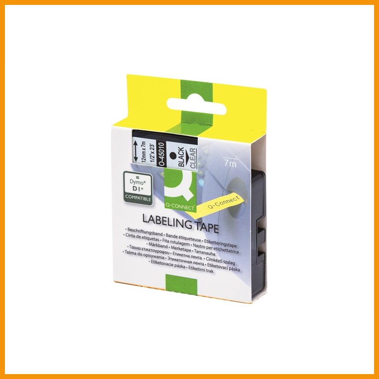 Q-CONNECT 45800 on DYMO D1 -yhteensopiva tarrakasetti DYMOn LabelManager-, LabelWriter- ja MobileLabeler-tarratulostimiin. Lämpösiirtomenetelmällä tulostettava teippi tarttuu erinomaisesti tasaisille ja puhtaille pinnoille.