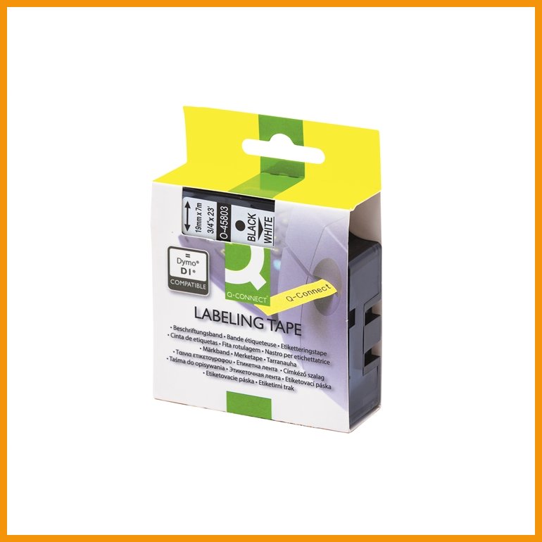 Q-CONNECT 45803 on DYMO D1 -yhteensopiva tarrakasetti DYMOn LabelManager-, LabelWriter- ja MobileLabeler-tarratulostimiin. Lämpösiirtomenetelmällä tulostettava teippi tarttuu erinomaisesti tasaisille ja puhtaille pinnoille.