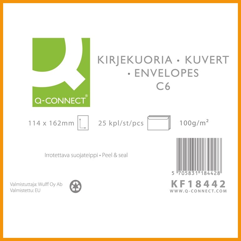 Q-CONNECTin uusiopaperisessa, tasaläppäisessä tarrakuoressa on harmaa sisuspainatus ja irrotettava suojateippi helppoon sulkemiseen. Lyhyeltä sivultaan aukeava kuori on valmistettu FSC-sertifioidusta kierrätysmateriaalista.Koko: C6 (114 x 162 mm)