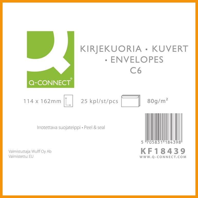 Q-CONNECTin tasaläppäisessä tarrakuoressa on harmaa sisuspainatus ja irrotettava suojateippi helppoon sulkemiseen. Lyhyeltä sivultaan aukeava kuori on valmistettu FSC-sertifioidusta materiaalista.Koko: C6 (114 x 162 mm)