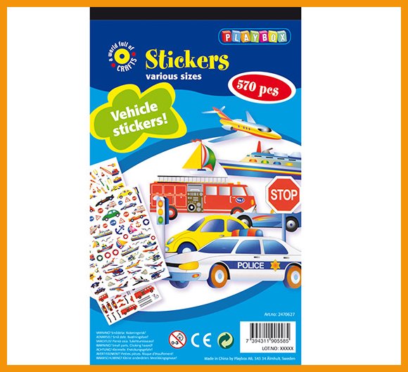 Playboxin ajoneuvotarroilla koristelet kortit ja lempitavarat. Lehtiössä on monen kokoisia tarroja.