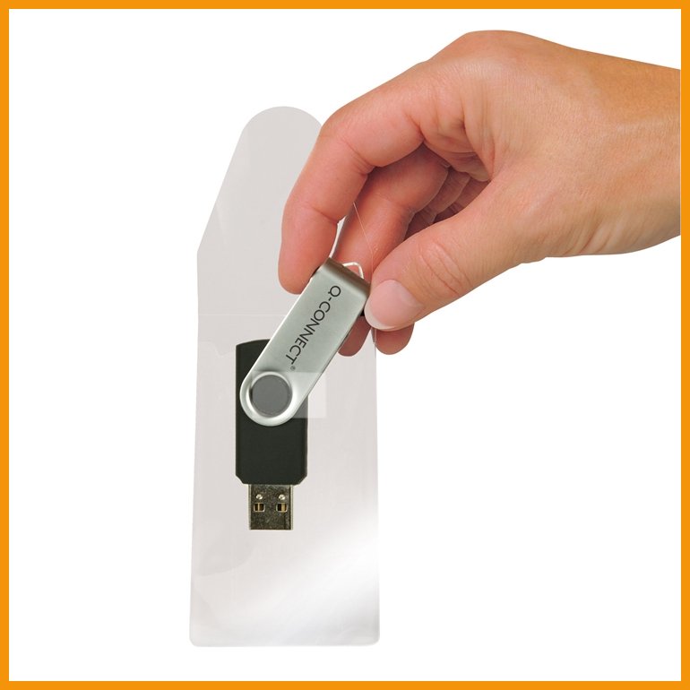 Q-CONNECTin tarrakiinnitteisissä taskuissa muistitikut, avaimet tai muut pienesineet pysyvät tallessa esimerkiksi tuote-esitteen mukana. Läppä pysyy kiinni tarramekanismilla.Mitat: 52,5 x 90 mm