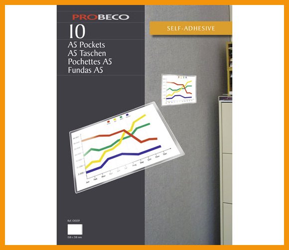 Lyhyeltä sivulta aukeava ja itseliimautuva Probeco Quickload -esitetasku A5-kokoiselle dokumentille. Pysyvällä liimalla varustettu tasku on helppo kiinnittää sileälle pinnalle, kuten oveen tai kansion sisäkanteen.Koko: A5 (158 x 218 mm)