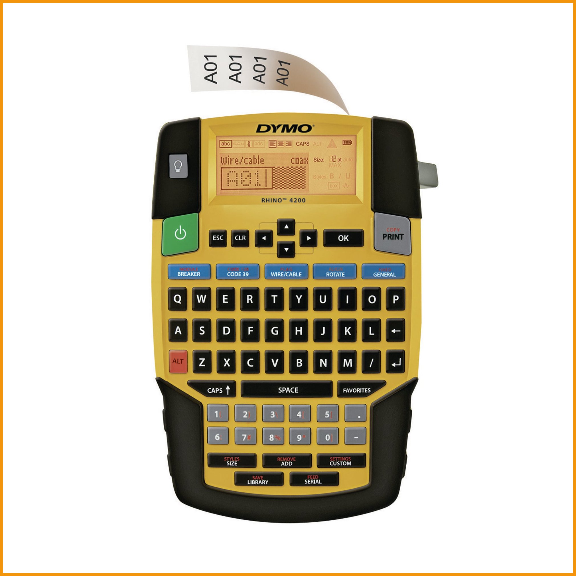 Tarratulostin Dymo Rhino 4200 on laadukas ja kompakti monipuolinen tarrakirjoitin ammattilaisille. Tarratulostimessa on pikanäppäimet eri tarroille ja siihen sopii 4 eri teippikokoa; 6, 9, 12 ja 19 mm Dymo teipit. Dymo Rhino 4200 teippikirjoittimessa on kahden vuoden takuu.