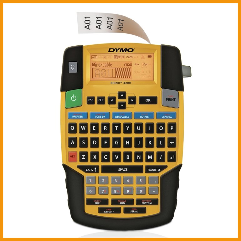 DYMO Rhino 4200 on etenkin teollisuuden tarpeisiin suunniteltu tarratulostin suurella, taustavalaistulla näytöllä ja kiinteillä kumisuojuksilla. Helppokäyttöisen laitteen pikanäppäimillä luot ja muokautat kietaisu- ja lipputarroja, Code 39- ja Code128 -viivakoodeja, yleis- ja moduulitarroja, kiinteäpituisia tarroja ym. Yhdellä painalluksella.Laitteella tulostat 6, 9, 12 tai 19 mm leveitä tarroja eri materiaaleille ja suoraan kutisteputkiin. Esiohjelmoidussa kirjastossa on 150 turvallisuus-, sähkö-, AV- ja huoltoalan symbolia ja termiä, ja usein tarvittujen tarrojen, symbolien ja termien käyttö onnistuu yhden suosikkinäppäimen painalluksella.