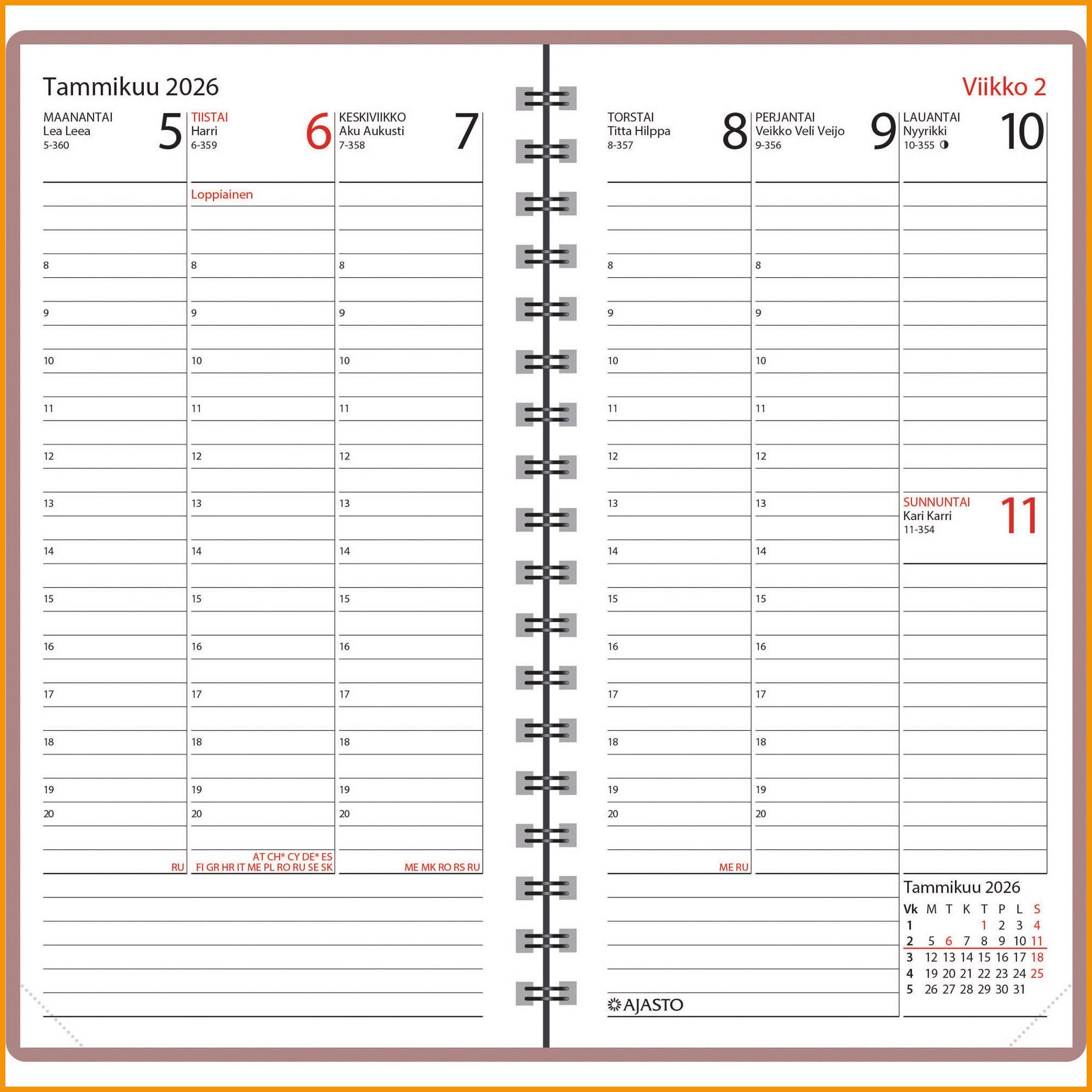 Hinta 11,15€ / kplAjasto Agenda 2026 taskukalenteri on todellinen klassikko. Kalenterissa on tyylikkäät mustat keinonahkakannet. Se kulkee helposti mukana, on kooltaan juuri sopiva ja toimii erinomaisesti päivittäisessä käytössä. Keskikokoisen Agenda-taskukalenterin aukeamalla on selkeälukuinen viikkonäkymä.VarastossaTarkastele- +