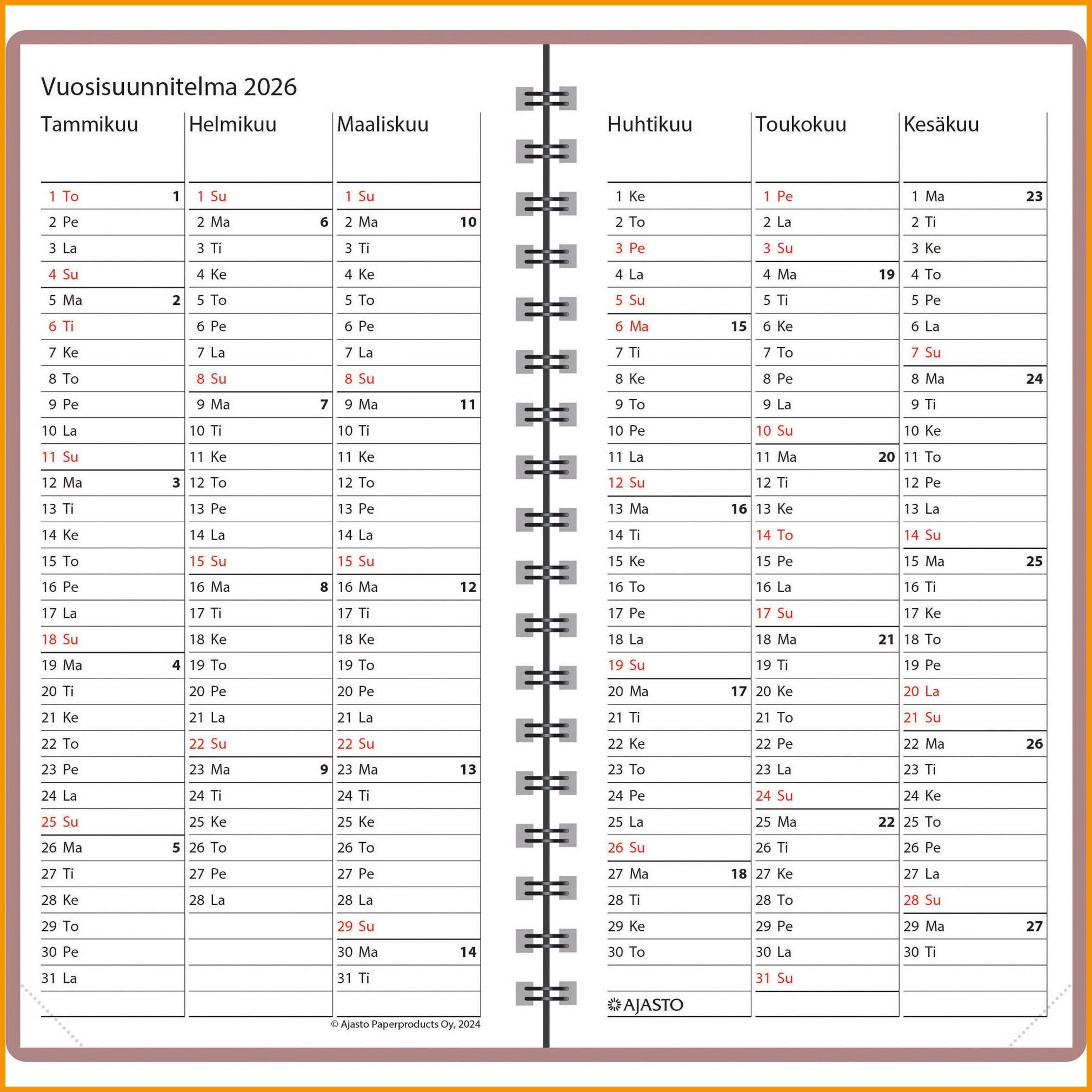 Taskukalenteri 2026 Ajasto agenda ruusukulta 85 x 162 mm on hyvä kalenteritarvike, jonka verkkokauppatilauksen toimitus perille kestää 1-2 päivää. Huomaa, että toimitus on ilmainen yli 140 € hintaisille verkkokauppa ostoksille! Meiltä voit tilata laskulla ja ilman rekisteröitymistä.