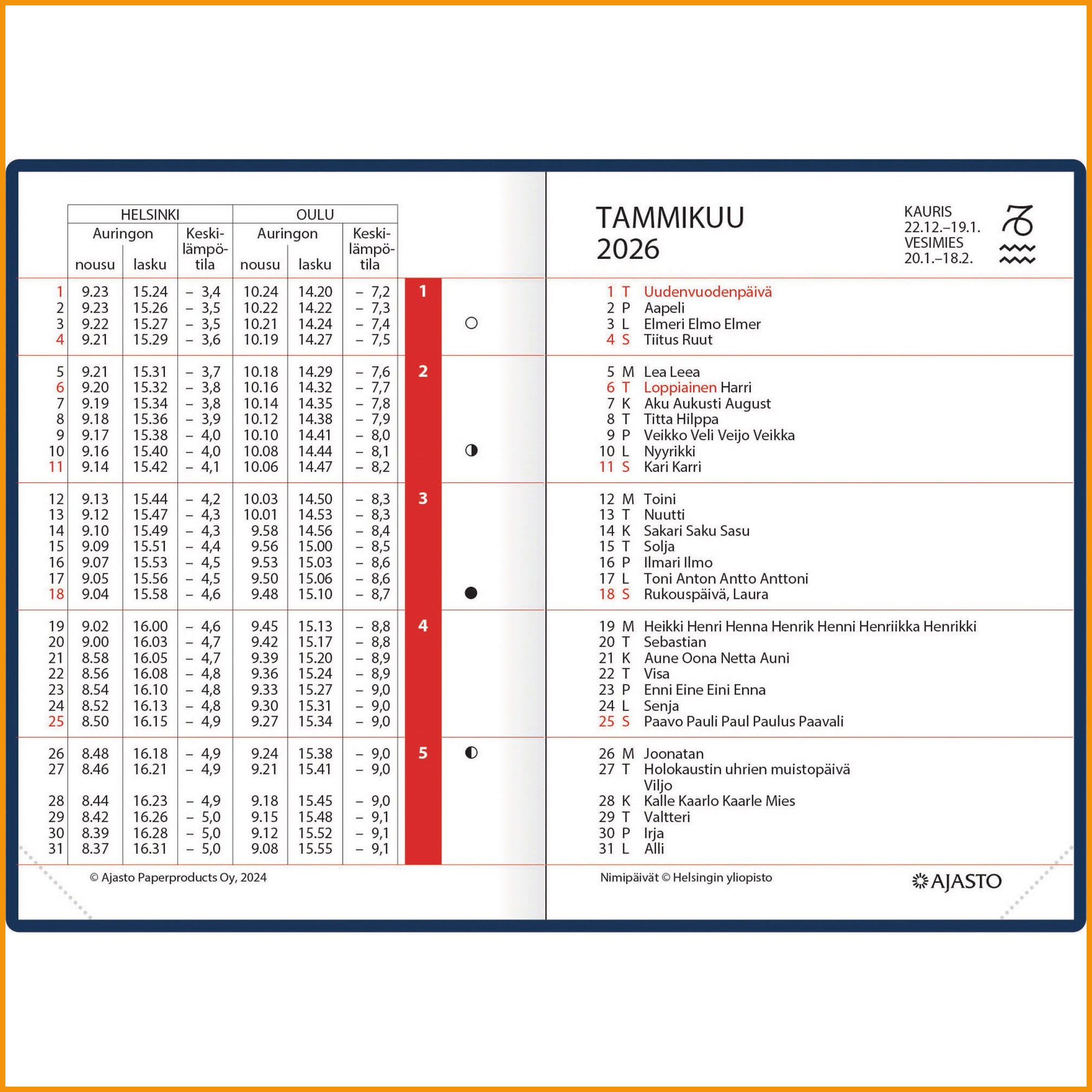 Taskukalenteri 2026 Ajasto ajastaika 72 x 102mm tummansininen tuotetiedot
