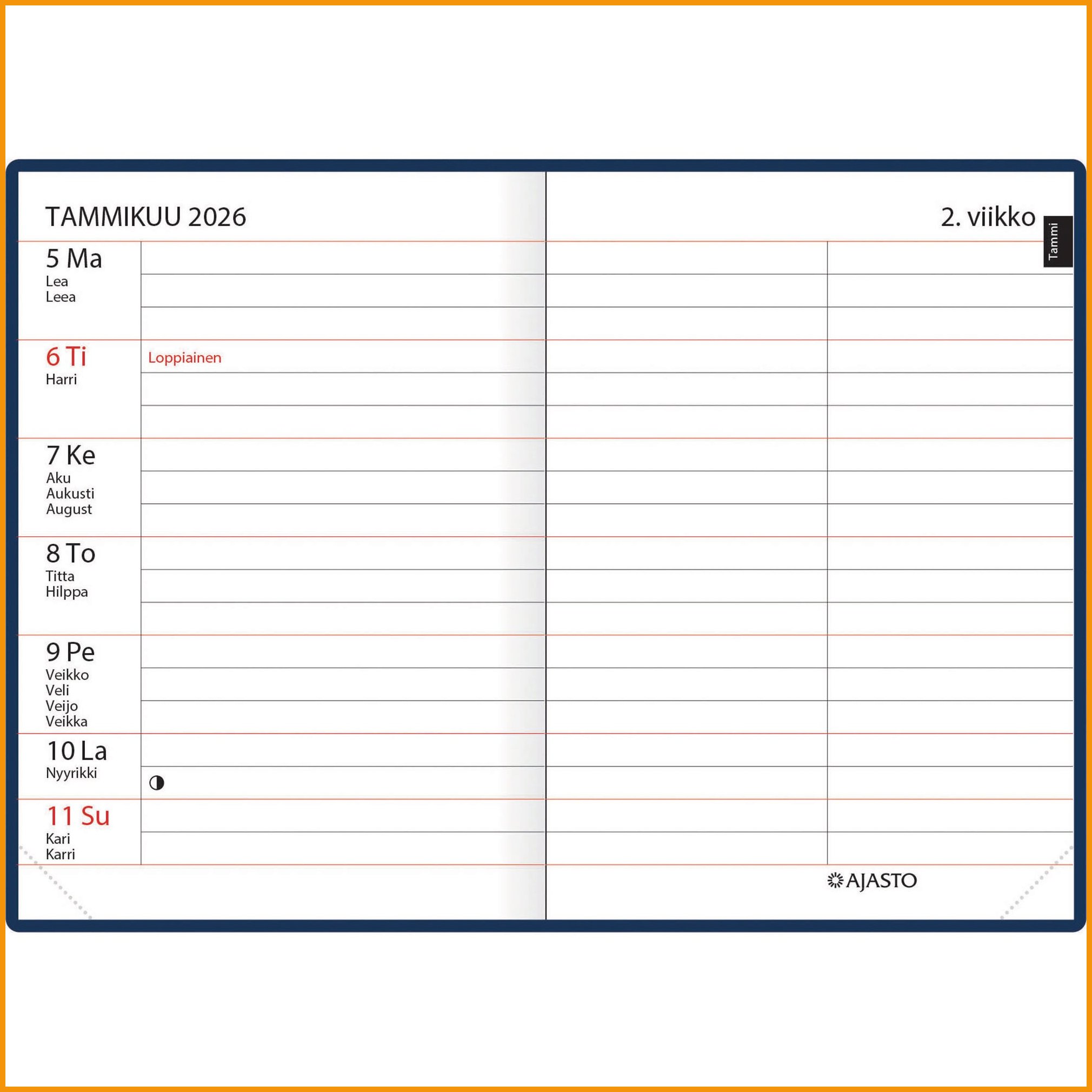 Hinta 25,38€ / kplVuoden 2026 Ajasto Futura 7 on laadukas taskukalenteri. Kalenterin kannet ovat tyylikästä mustaa keinonahkaa. Kalenteri näyttää aukeamalla täyden viikon, kuluvan viikon numeron sekä kuukausiseurannan. Päivät ovat sijoitettu viikkoaukeamalle vierekkäin ja jokaisen päivän alle on jätetty ...VarastossaTarkastele- +