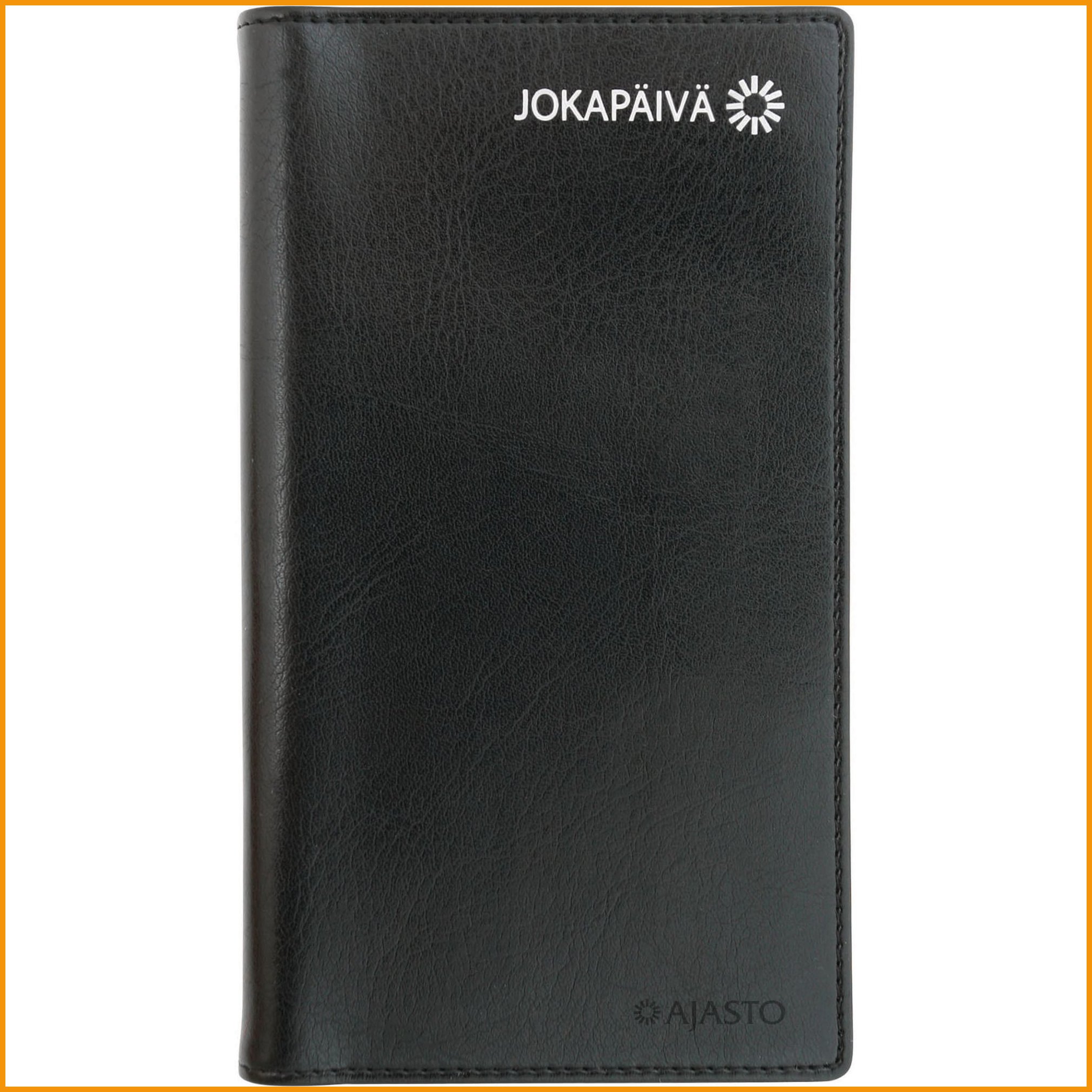 Ajasto Jokapäivä 2026 taskukalenteri kulkee kätevästi mukanasi. Näet selkeällä aukeamalla koko viikon, viikkonumeron ja kuukauden seurannan. Jokapäivä-taskukalenterin kannet ovat tyylikästä mustaa keinonahkaa. Kalenteri sisältää hyödyllistä tietoa muun muassa nimipäivistä, liputuspäivistä ja kansallisista vapaapäivistä. Ajasto Jokapäivä 2026 tärkeimmät ominaisuudet: koko 85 x 162 mm päiväkirja 47/2025–3/2027 vuosisuunnitelmat 2026 ja 2027 liputuspäivät Suomessa suomalaiset nimipäivät kansalliset vapaapäivät auringon nousu- ja laskuajat (Helsinki, Oulu) kuun- ja auringonpimennykset tietoja Suomesta ja EU:sta välimatkataulukkokynäpidike FSC®-sertifioitu tuote Ajasto-kalenterit ovat pääosin kotimaista tuotantoa. Kalentereiden suunnittelussa muiden muassa ekologisuus ja laatu ovat tärkeässä asemassa. Jokapäivä 2026 musta taskukalenteri painetaan sertifioidulle paperille. Sertifioidulla FSC-paperilla olet mukana edistämässä vastuullista metsänhoitoa. Kalentereilla ei ole vaihto- eikä palautusoikeutta.