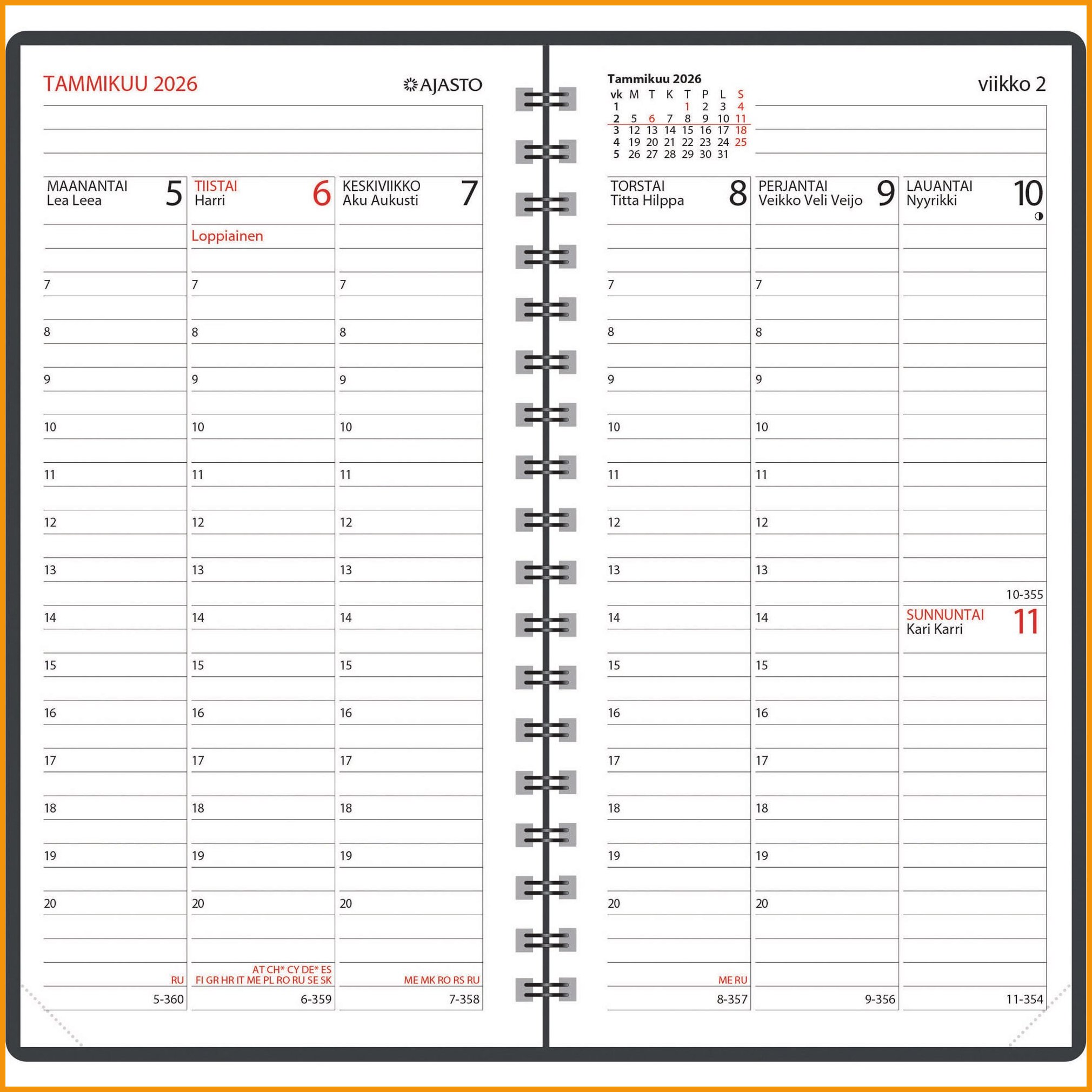 Hinta 11,15€ / kplAjasto Agenda 2026 taskukalenteri on todellinen klassikko. Kalenterissa on tyylikkäät mustat keinonahkakannet. Se kulkee helposti mukana, on kooltaan juuri sopiva ja toimii erinomaisesti päivittäisessä käytössä. Keskikokoisen Agenda-taskukalenterin aukeamalla on selkeälukuinen viikkonäkymä.VarastossaTarkastele- +