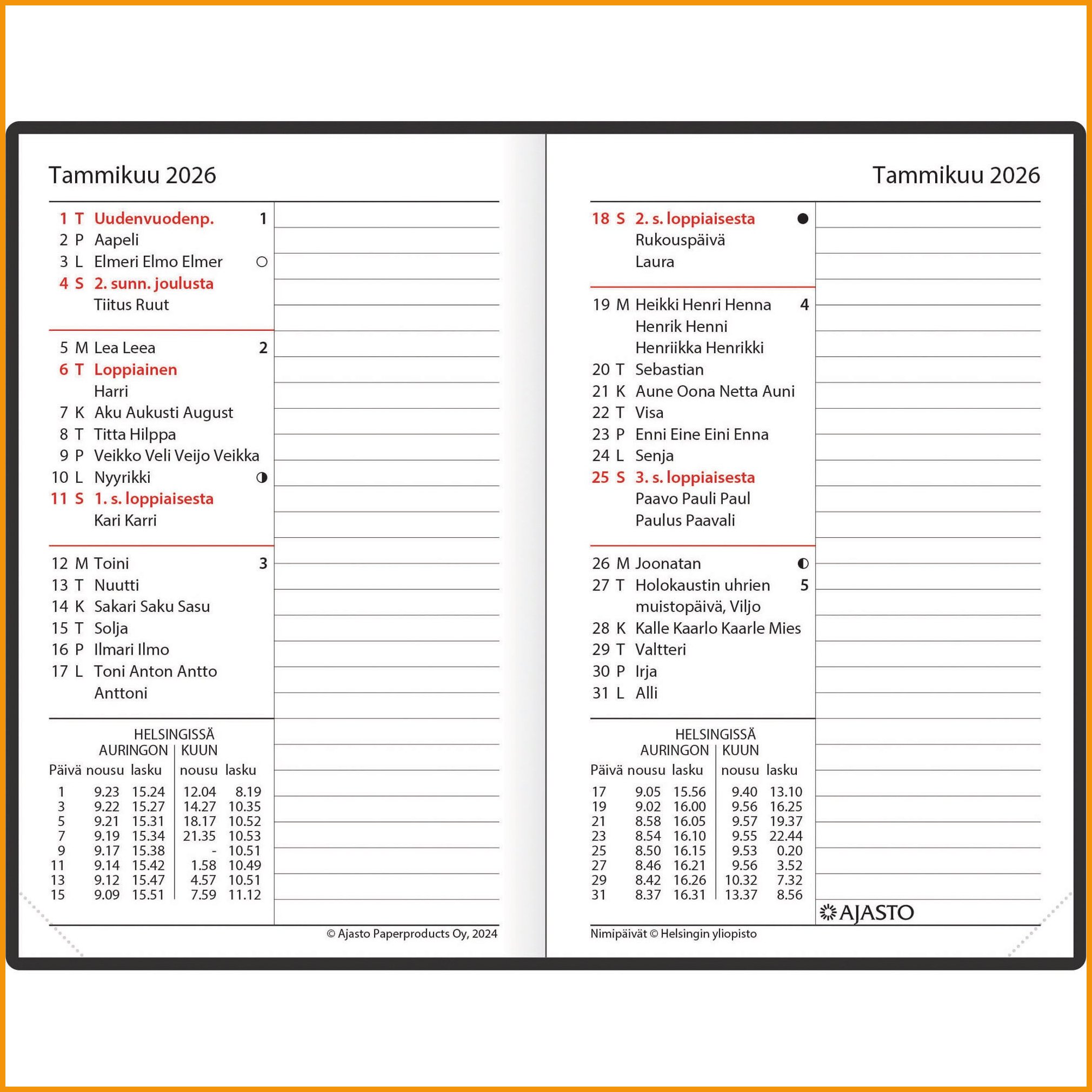 Taskukalenteri 2026 Ajasto muistikalenteri musta 82 x 128mm on erinomainen kalenteritarvike, jonka verkkokauppatilauksen toimitus perille kestää 1-2 päivää. Tiedäthän, että toimitus on ilmainen yli 140 € hintaisille verkkokauppa ostoksille! Meiltä voit tilata laskulla ja ilman rekisteröitymistä.