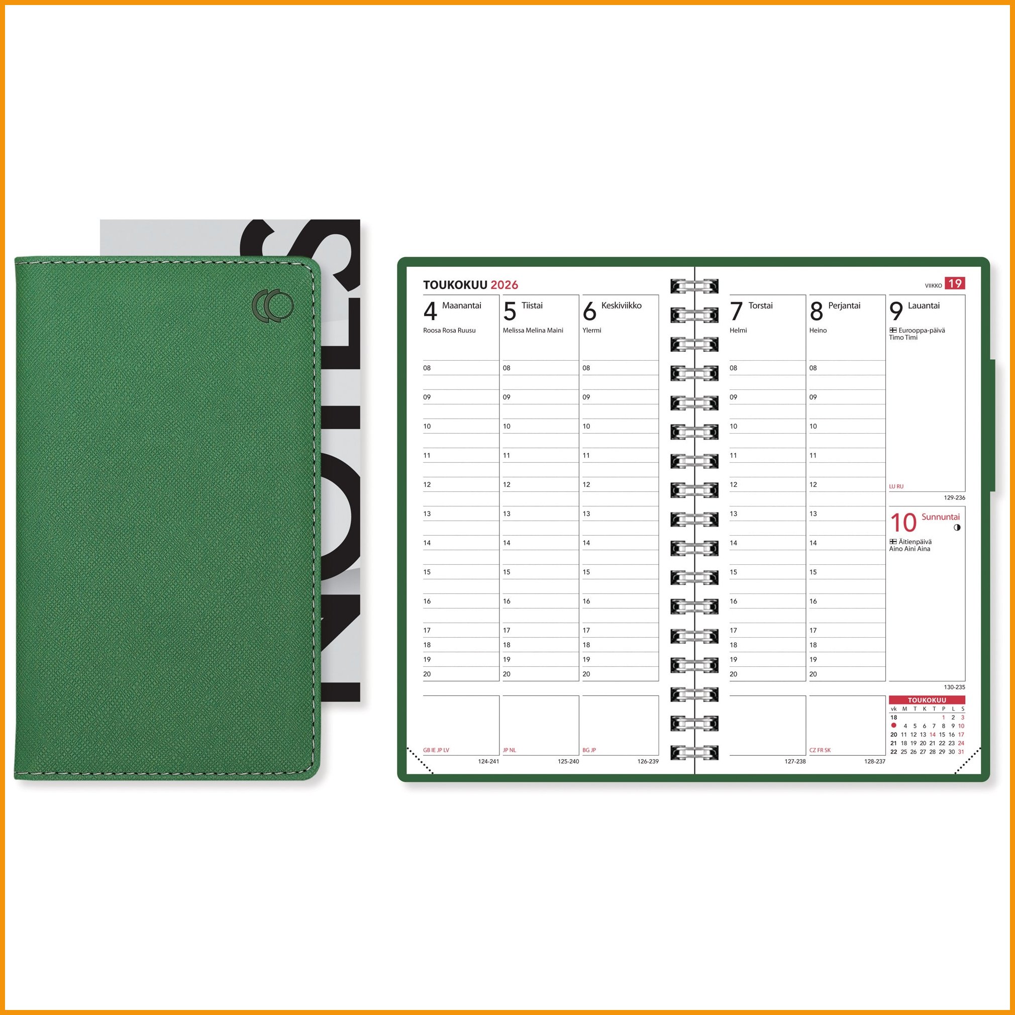 Taskukalenterissa on tyylikkäät vihreät keinonahkakannet, jotka kätkevät sisälleen siirrettävän Notes-muistion ja tarjoavat myös pientä säilytystilaa. Oikeassa reunassa on käytännöllinen kynäholkki, ja jämäkkä kierresidonta varmistaa, että kalenteri pysyy hyvin auki myös pöydällä. Jokainen sivu on kulmastaan perforoitu, mikä helpottaa viikkoseurantaa.