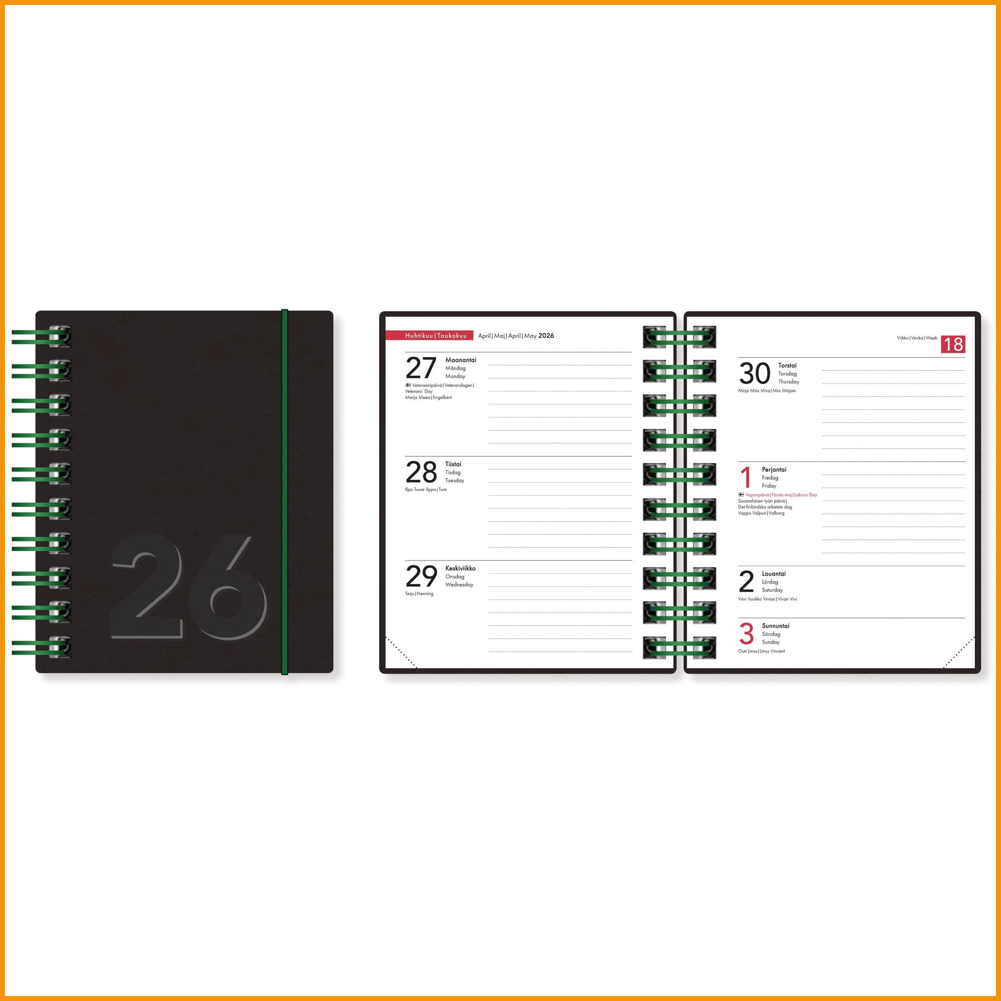 Hinta 25,38€ / kplVuoden 2026 Ajasto Futura 7 on laadukas taskukalenteri. Kalenterin kannet ovat tyylikästä mustaa keinonahkaa. Kalenteri näyttää aukeamalla täyden viikon, kuluvan viikon numeron sekä kuukausiseurannan. Päivät ovat sijoitettu viikkoaukeamalle vierekkäin ja jokaisen päivän alle on jätetty ...VarastossaTarkastele- +