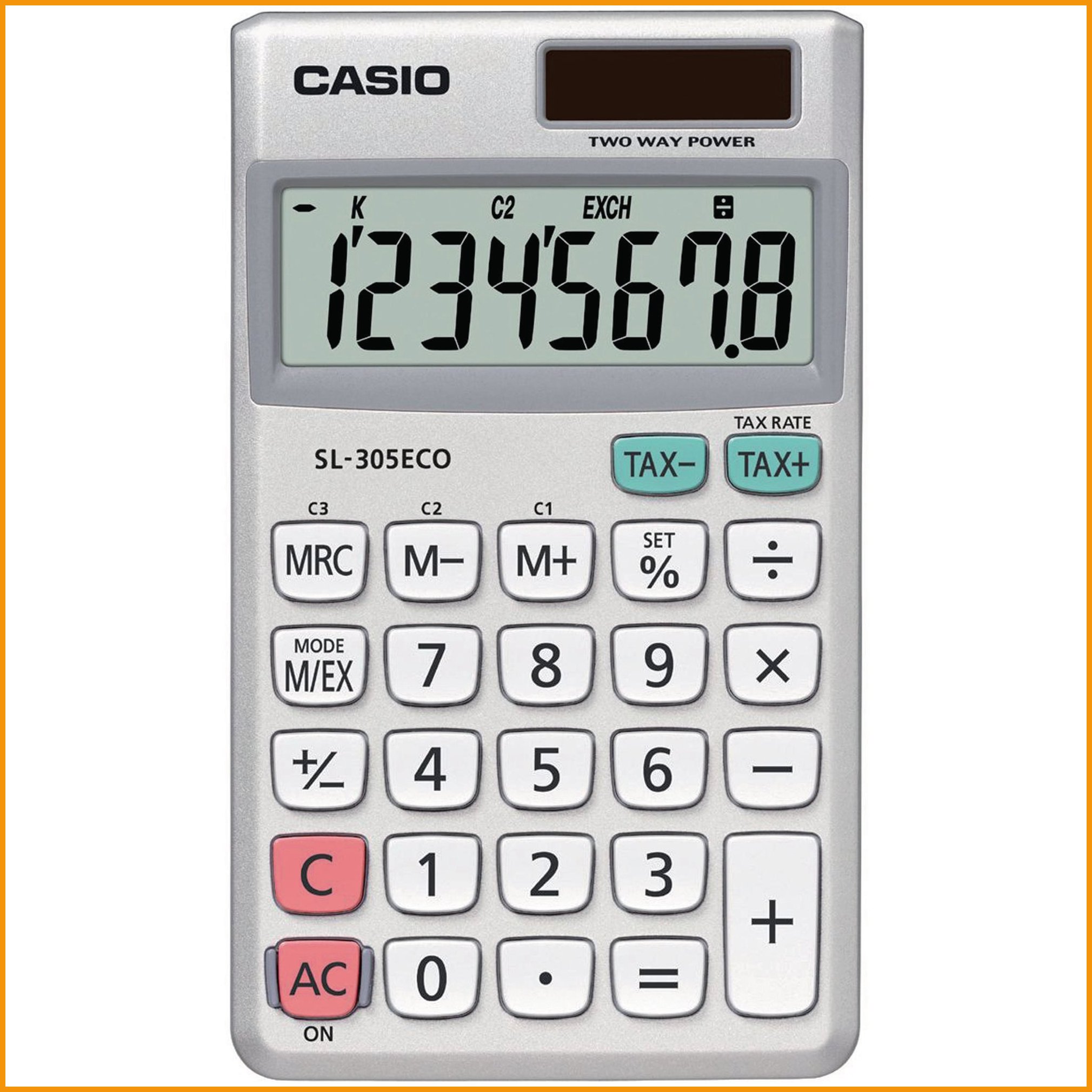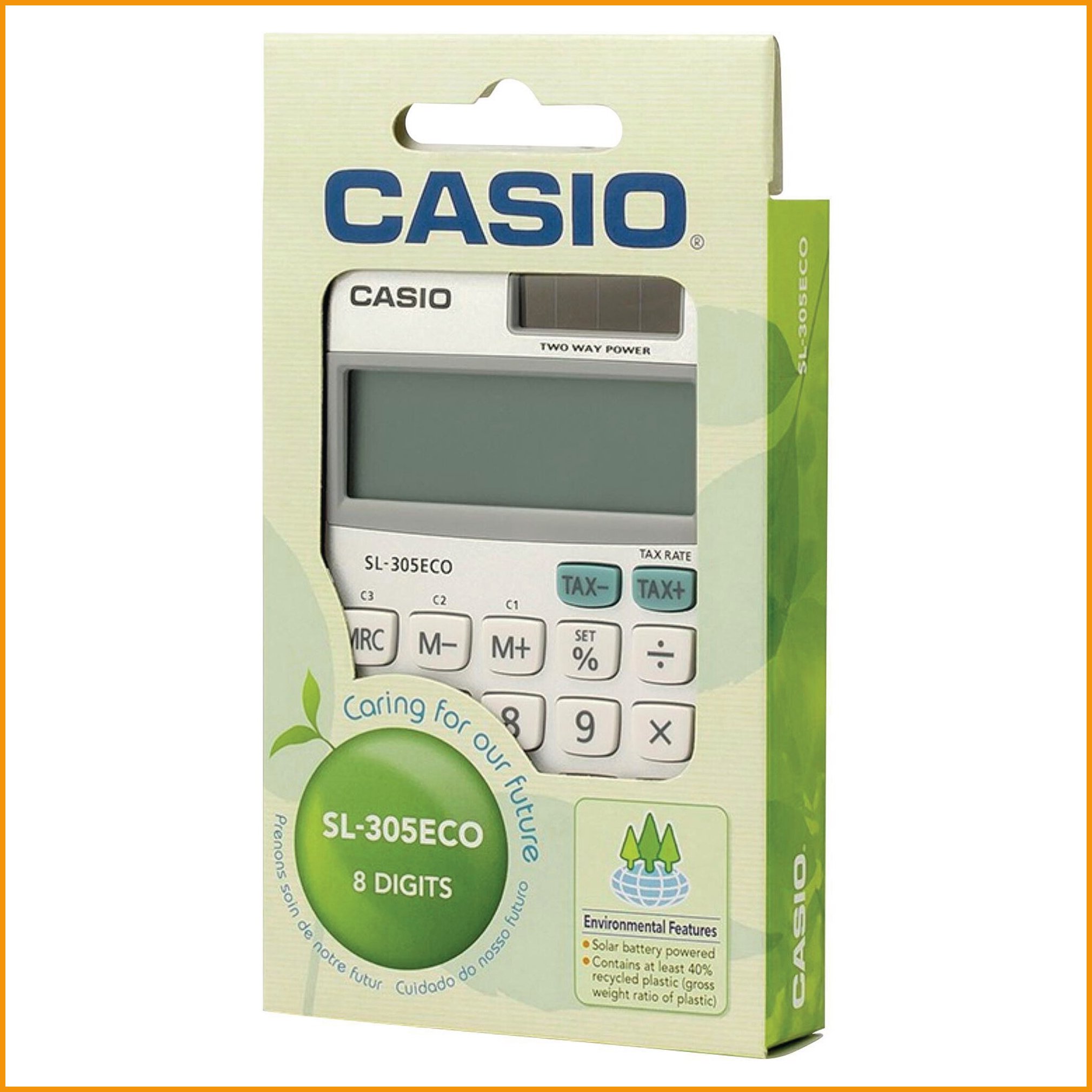 40-prosenttisesti kierrätysmateriaaleista valmistetussa casio sl-305 eco -taskulaskimessa on 8 numeron näyttö ja seuraavat toiminnot:- Etumerkinvaihto