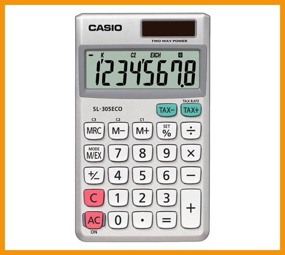 Hinta 8,49€ / kpl40-prosenttisesti kierrätysmateriaaleista valmistetussa casio sl-305 eco -taskulaskimessa on 8 numeron näyttö ja seuraavat toiminnot: • valuuttalaskenta c1, c2, c3 • verolaskenta tax+, tax- • etumerkinvaihto • 7-toiminen %-näppäin valokennolla toimivassa laskimessa on paristovarmennus.