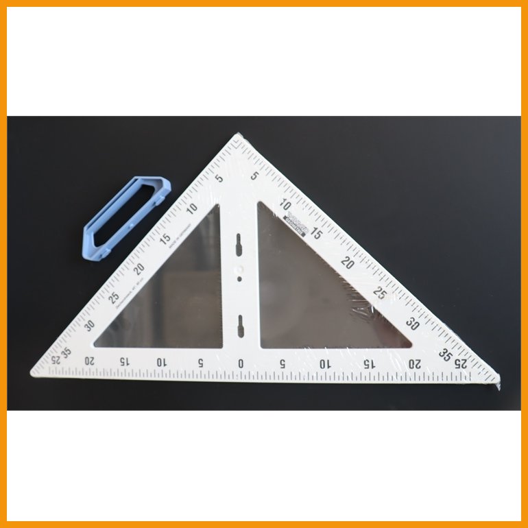 Muovista valmistettu valkoinen taulukolmio irrotettavalla kahvalla, 45 ja 90 asteen kulmilla ja mitta-asteikolla.Leveys: 60 cm.
