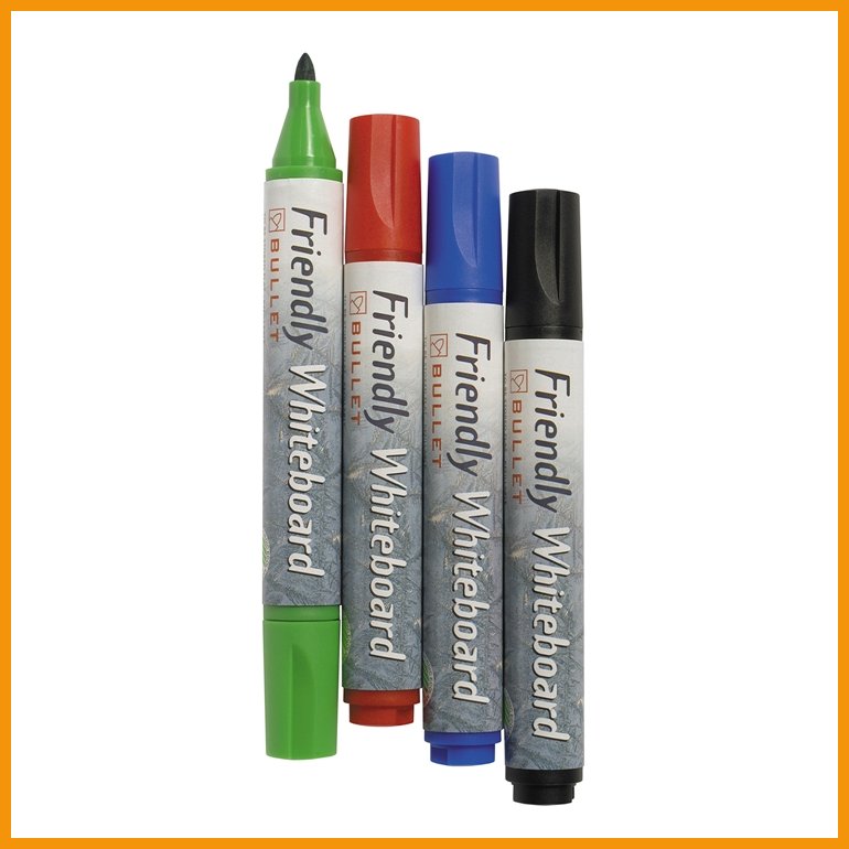 Ballograf Friendly Whiteboard -valkotaulukynän runko on valmistettu luonnonvahalla pinnoitetusta kartongista. Myös muoviosat on valmistettu kierrätysmuovista. Koko tuotteesta kierrätysmateriaalien osuus on 76 %. Vesiliukoinen muste on myrkytöntä.Musteen väri: keltainen, sininen, punainen ja vihreä