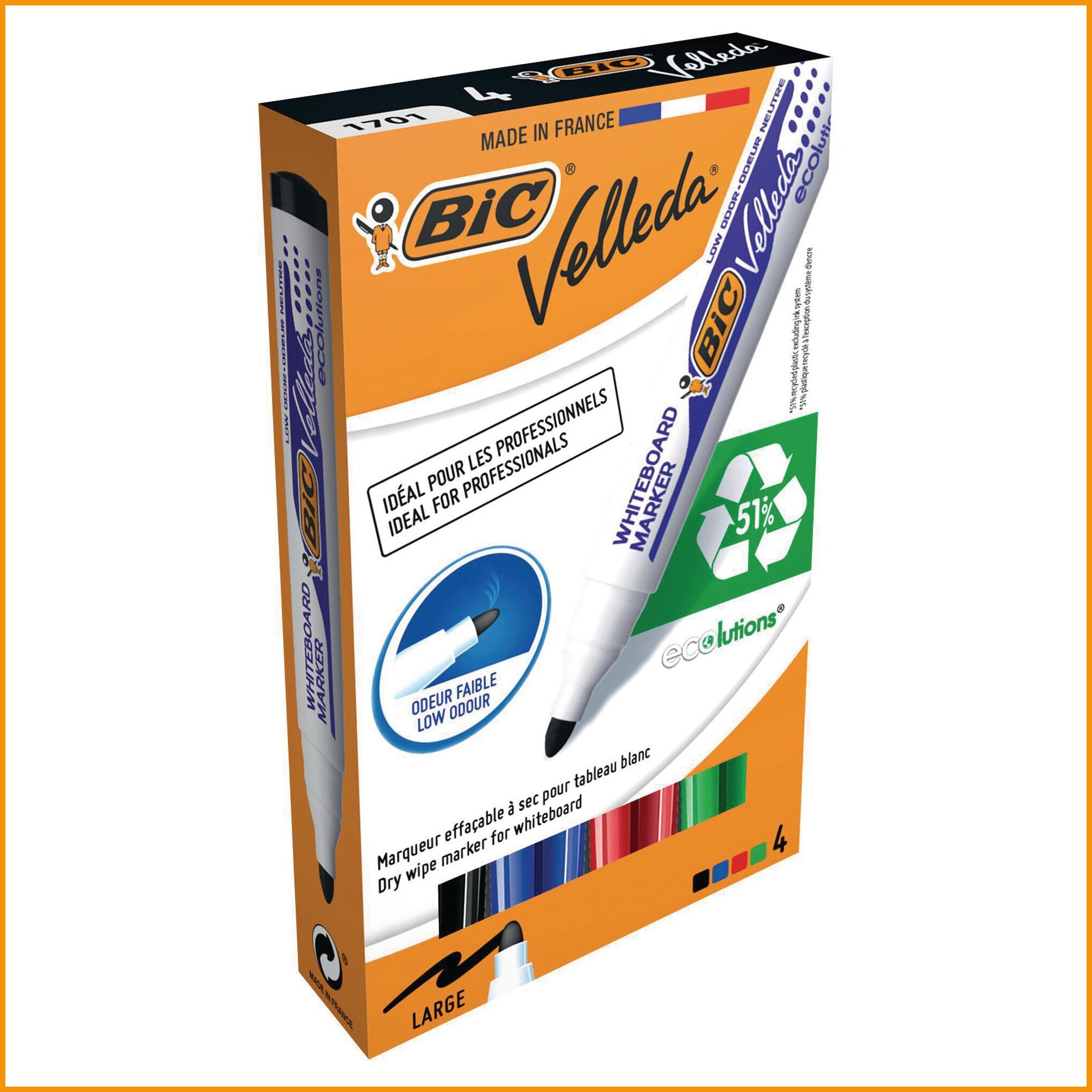 Bic velleda 1701 -valkotaulukynän alkoholipohjainen, lähes hajuton muste pyyhkiytyy pois kuivalla liinalla. ympäristöystävällinen kynä on valmistettu 51-prosenttisesti kierrätysmateriaalista. lajitelmassa on neljä väriä: sininen, punainen, vihreä ja musta. medium-kärki, viivan leveys 1,5 mm. Taulutussien minimitilaus 1 paketti = 4 kpl. Tukkupakkauksessa 88 kpl.Taulutussit toimitetaan 4 kappaleen erissä.